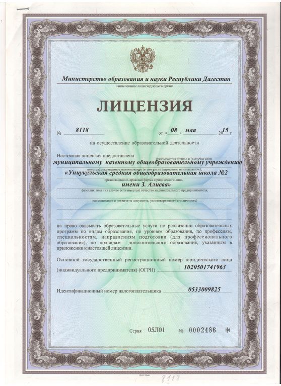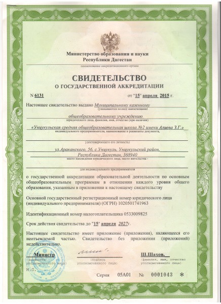 | Полное наименование образовательной организации* | Муниципальное казенное общеобразовательное учреждение "Унцукульская средняя общеобразовательная школа №2" имени З.Г.Алиева |